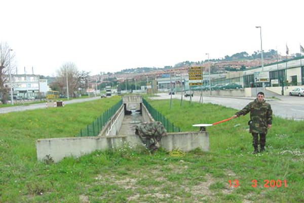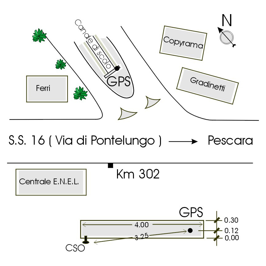 | materializzazione | Centrino in acciaio inox del tipo "GPS da livellazione" infisso all'estremità est del parapetto in calcestruzzo esistente alla testata del canale di raccolta delle acque ubicato nella mezzeria di un'aiuola spartitraffico del viale di accesso alla zona industriale. |
