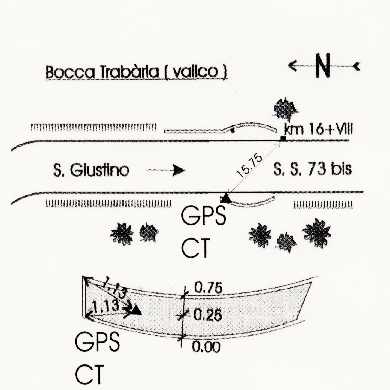 | Materializzazione | Centrino in acciaio inox del tipo "GPS da livellazione" infisso nel muretto di contenimento esistente sul valico di Bocca Trabaria a circa m 6 dalla pietra chilometrica 16+VIII della S.S. 73 bis. |
