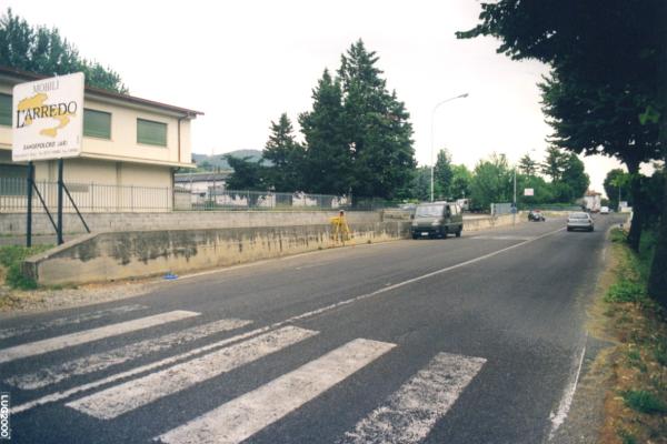 Centrino in acciaio inox del tipo "GPS da livellazione" infisso alla base del muro a retta esistente sul lato destro della strada, procedendo in direzione di Sansepolcro, di fronte al Liceo Scientifico "Piero della Francesca".