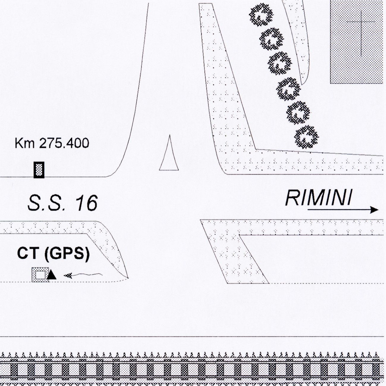 Centrino in acciaio inox del tipo "GPS da livellazione" infisso nel pozzetto in calcestruzzo armato per la raccolta delle acque piovane esistente sul lato destro della strada procedendo in direzione di Rimini, all'altezza del km 275,400.