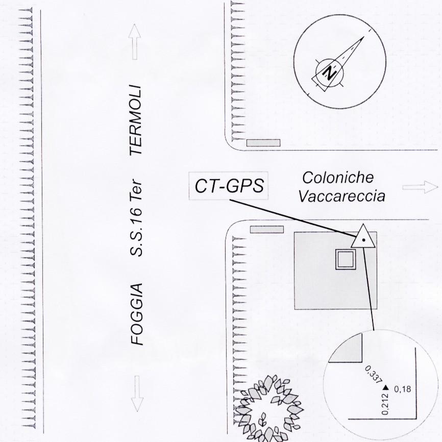 Centrino in acciaio inox del tipo "GPS da livellazione" infisso presso lo spigolo nord del tombino in cemento dell'impianto d'irrigazione, esistente sul lato destro dell'imbocco della strada che conduce a località Vaccareccia.