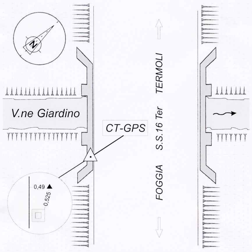 Centrino in acciaio inox del tipo "GPS da livellazione" infisso nella soletta del ponte, lato destro procedendo in direzione di Foggia.