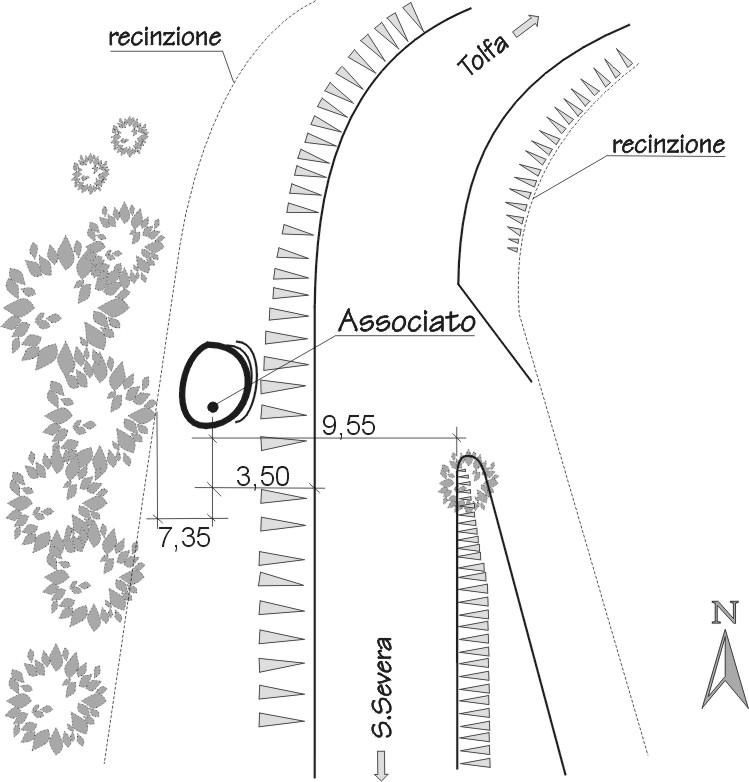 | materializzazione | Centrino in acciaio inox del tipo "GPS D" infisso in roccia affiorante esistente a circa 3,50 m dal bordo volto ad ovest della strada che da S.Severa conduce a Tolfa, circa 550 m a nord-est del CT-GPS. |