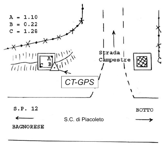 | materializzazione | Centrino metallico infisso sullo spigolo sud-ovest del tombino in calcestruzzo di un accesso campestre lungo la strada comunale di Piancoleto, circa Km. 1 m dopo aver lasciato la S.P. 12 Bagnorese. |
