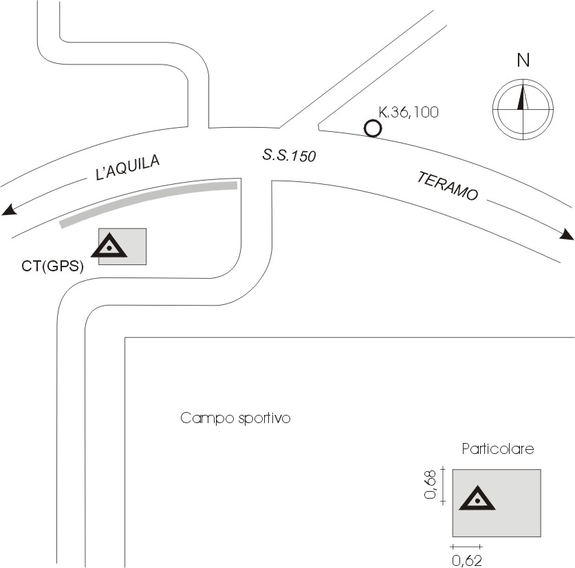 Centrino in acciaio inox del tipo "GPS da livellazione" infisso nella soletta di copertura della cisterna idrica in cemento armato ubicata presso il campo sportivo comunale, in corrispondenza del km 36,165 della S.S. 150.