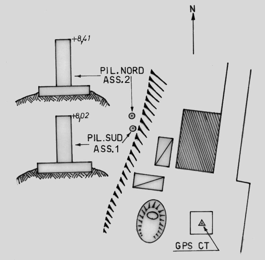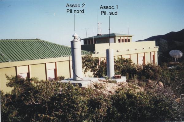 | materializzazione | Centrino metallico con foro al centro fissato alla sommità di un pilastrino cilindrico, il più a sud dei due presenti sopra alla scarpata subito a ovest dell'edificio principale all'interno del recinto dell'Osservatorio Astronomico di Poggio dei Pini. |