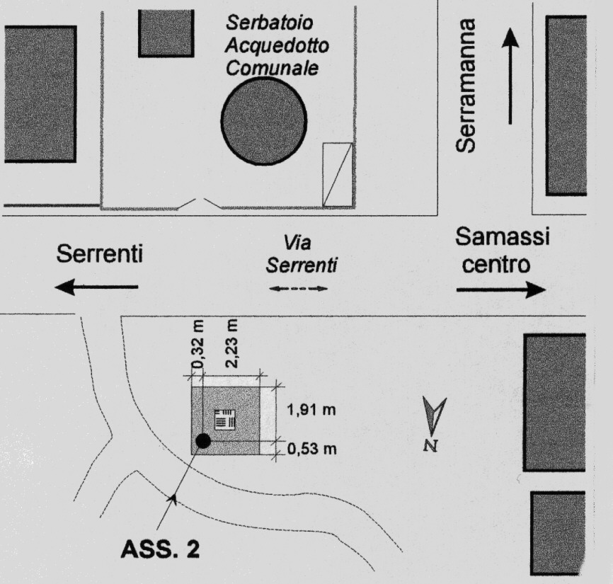 Centrino del tipo "GPS D" infisso alla sommità del tombino dell'acquedotto, in corrispondenza dello spigolo nord-est.