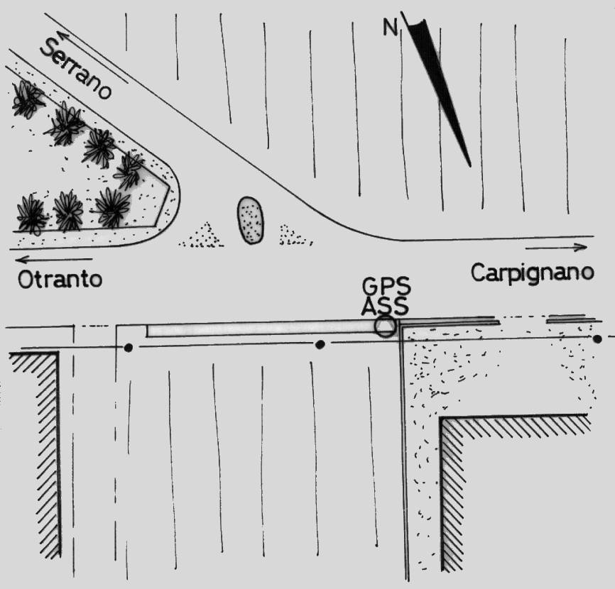 Centrino del tipo "GPS C" fissato sul muro in cemento sulla S.P. 48 all'incrocio per il paese di Serrano.