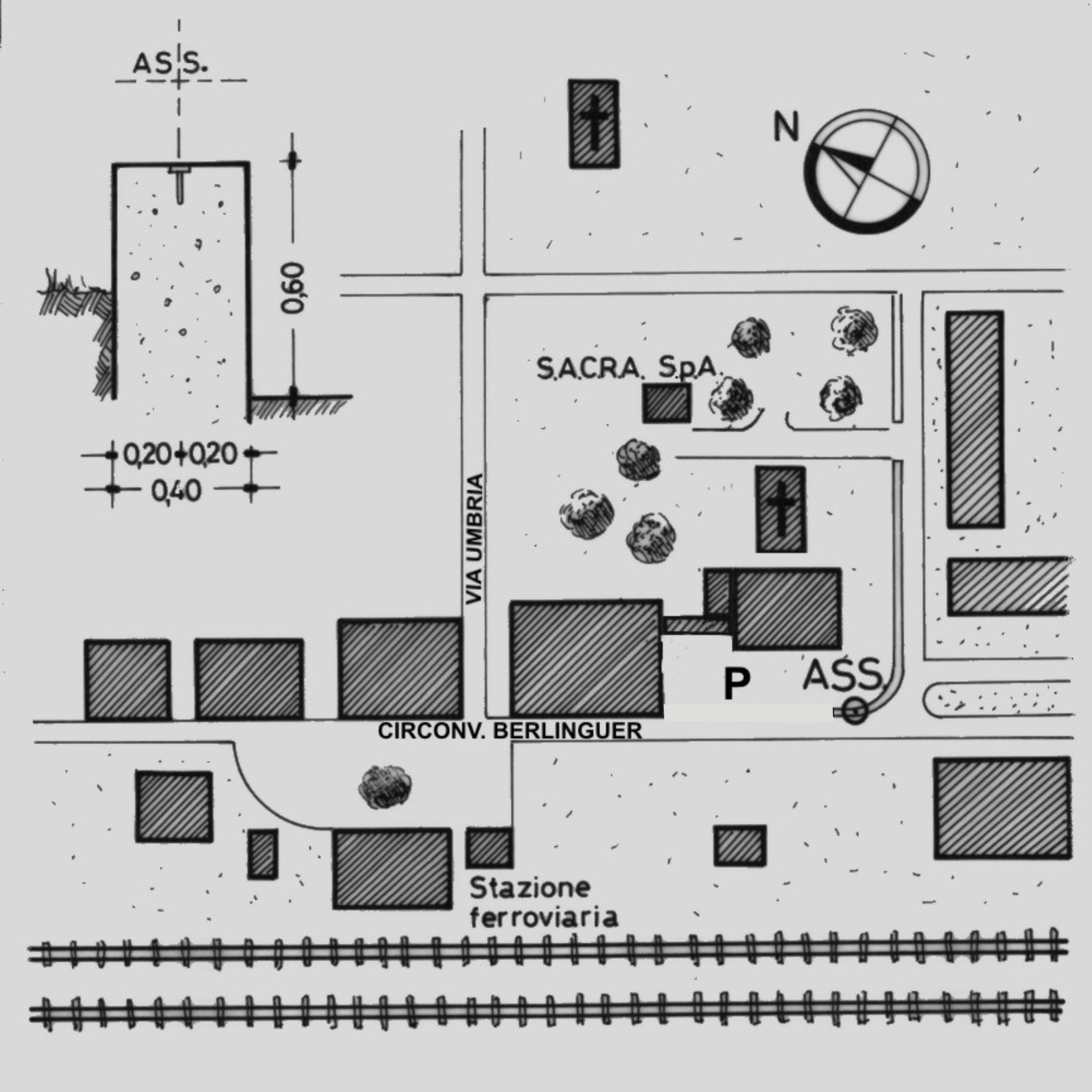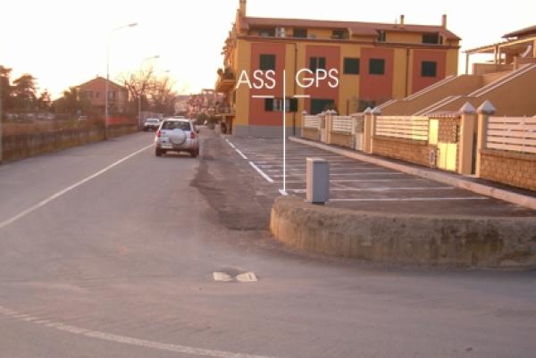 | materializzazione | Centrino del tipo "GPS D" fissato alla sommità di un muretto in cemento armato, che delimita la proprietà di un condominio, proprio in corrispondenza di una curva ad angolo retto della circonvallazione Berlinguer, di fronte al muro di recinzione dell'area di rispetto della stazione ferroviaria.. |