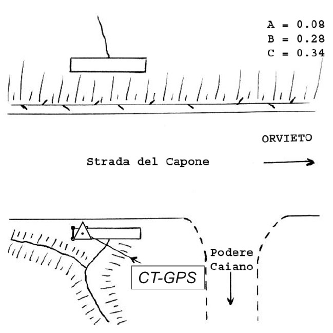 | materializzazione | Centrino metallico infisso sullo spigolo sud-ovest del tombino in calcestruzzo della strada del Lapone, al Km 2+600 circa, in località Caiano. |