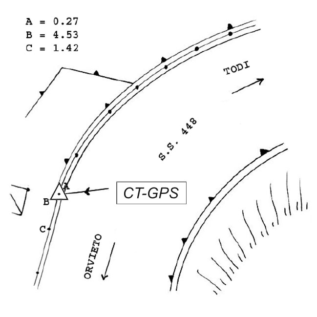 | materializzazione | Centrino metallico infisso sulla sommità, lato ovest, del muro di sostegno in calcestruzzo a valle della S.S. 448 del Lago di Corbara, al km 10+600. |