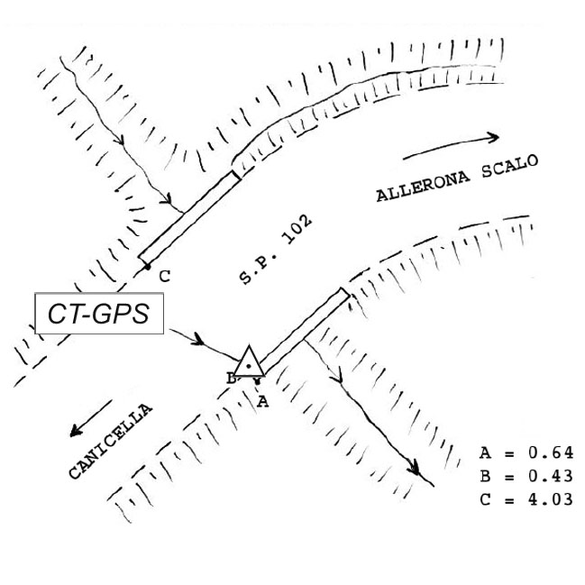 | materializzazione | Centrino metallico infisso sulla sommità della spalla sud-est del ponticello in calcestruzzo della S.P. 102 della Val di Paglia sul fosso, al Km 6+600 della provinciale, in località Canicella. |