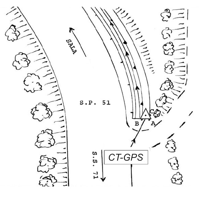 | materializzazione | Centrino metallico infisso sulla sommità, lato sud, del muro di sostegno a monte della S.P. 51 della Sala, al Km 0+100, all'incrocio con una strada di accesso ad una abitazione. |