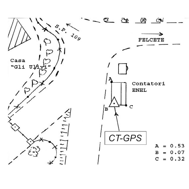 | materializzazione | Centrino metallico infisso sullo spigolo sud-ovest del basamento in calcestruzzo della cabina contatori dell'ENEL, in località Felcete, vicino all'abitazione denominata "Ulivi". |
