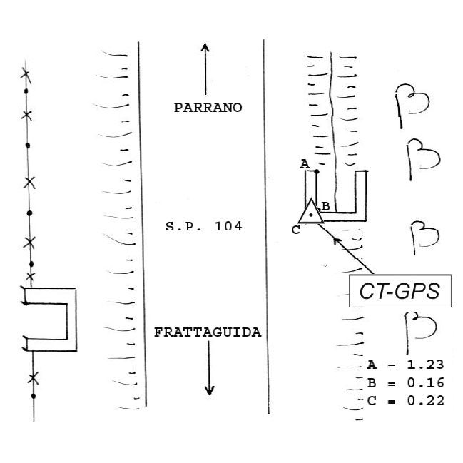 | materializzazione | Centrino metallico infisso sullo spigolo sud-est del tombino in calcestruzzo della S.P. 104 di Frattaguida, al Km 13+450, 500 metri circa fuori dell'abitato di Parrano. |