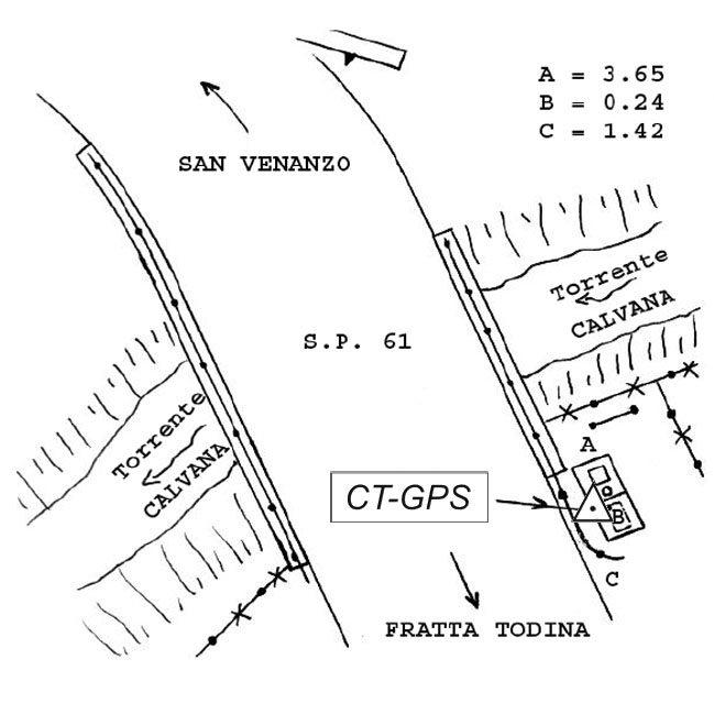 | materializzazione | Centrino metallico infisso sullo spigolo del pozzetto in calcestruzzo del metano, nei pressi della spalla del ponte della S.P.61 di San Venanzo-Fratta Todina sul torrente Calvana, al Km 1+650, vicino al bivio per Rotecastello. |