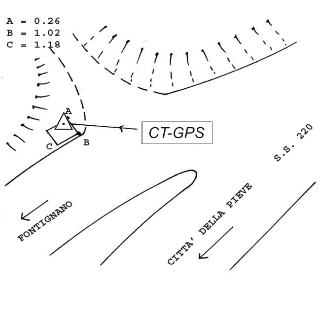Centrino metallico infisso sullo spigolo est del pozzetto in calcestruzzo della fognatura, posto a lato della Strada Comunale per Fontignano, 20 metri dopo il bivio con la Pievaiola.