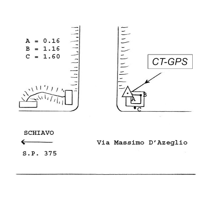 Centrino metallico infisso sullo spigolo nord-est del tombino in calcestruzzo di Via Massimo D'Azeglio, a Schiavo, nei pressi del sottopasso ferroviario, vicino agli impianti sportivi e alla chiesa parrocchiale.