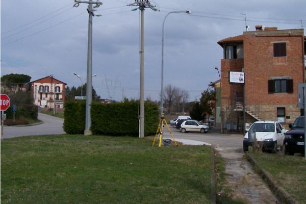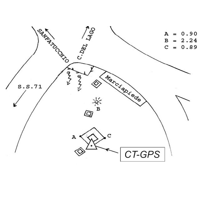 | materializzazione | Centrino metallico infisso sullo spigolo sud del telaio in calcestruzzo di un pozzetto all'interno dell'aiuola all'incrocio tra Via Piemonte e Via Lombardia, al km 96+000 circa, della vecchia S.S. 71 Umbro – Casentinese, a sud dell'abitato di Sanfatucchio. |