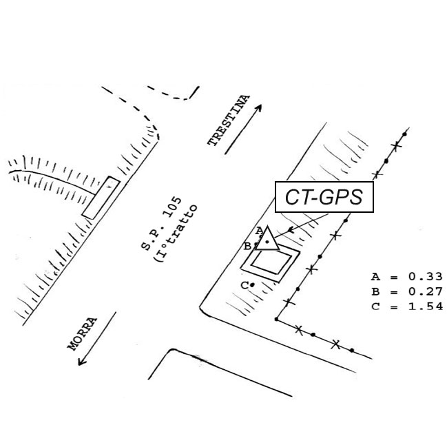 | Materializzazione | Centrino metallico infisso sullo spigolo nord-est del cordolo in calcestruzzo del tombino della S.P. 105 di Trestina (1° tratto), in località Calzolaro, al Km 12+900 circa della provinciale. |