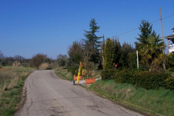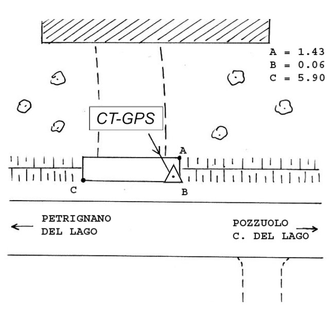 | materializzazione | Centrino metellico infisso sullo spigolo sud-est del tombino in calcestruzzo di un accesso privato, lungo la strada Pozzuolo – Petrignano del Lago, in località Podere Caprara. |