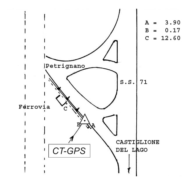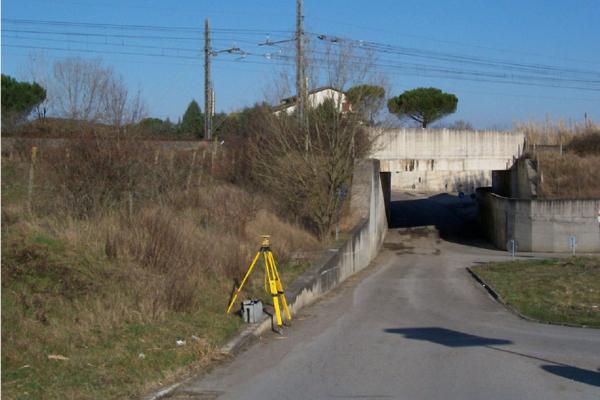 Centrino metallico infisso sull'estremità sud, lato est, del muro di sostegno in calcestruzzo del sottopasso ferroviario della S.P. 302 al bivio con la S.S. 71, al km 109+300.