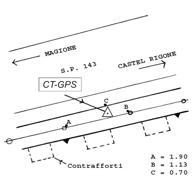 | materializzazione | Centrino metallico infisso sulla sommità del muro di sostegno in calcestruzzo lungo la S.P. 143, al km 6+650. |