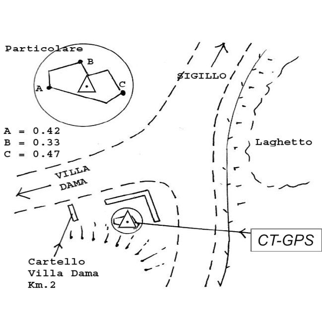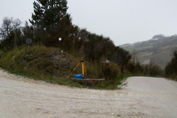Centrino metallico infisso sul cordolo del tombino in calcestruzzo al bivio di due strade sterrate.