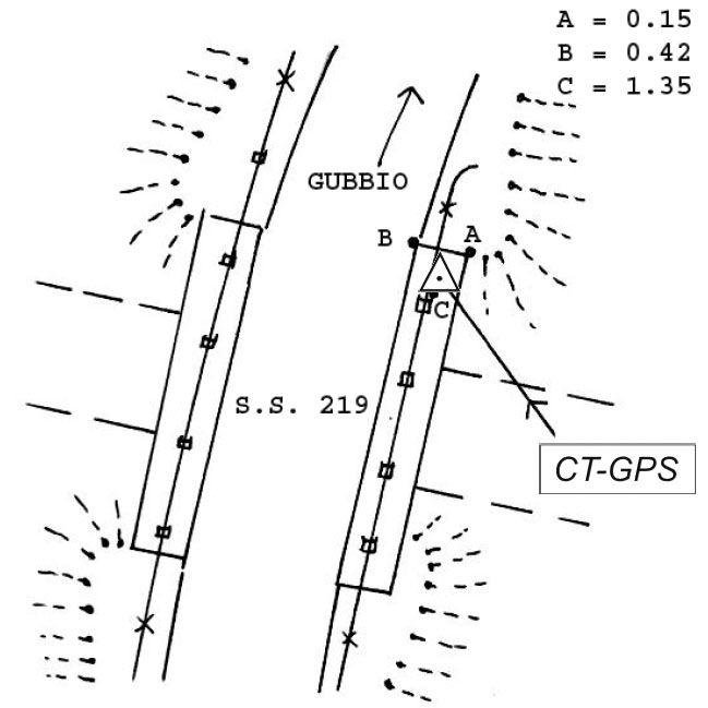 | Materializzazione | Centrino metallico infisso sul cordolo sinistro dello spigolo nord del cavalcavia della S.S. 219, all'altezza del km 39+800. |