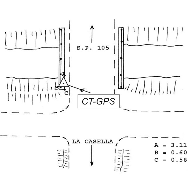 | materializzazione | Centrino metallico infisso sulla sommità della spalla sud – ovest del ponte in calcestruzzo della strada vicinale "La Casella" sul torrente Scano, in località La Casella, nei pressi del km 16+300 della S.P. 105 di Trestina (1° tratto). |
