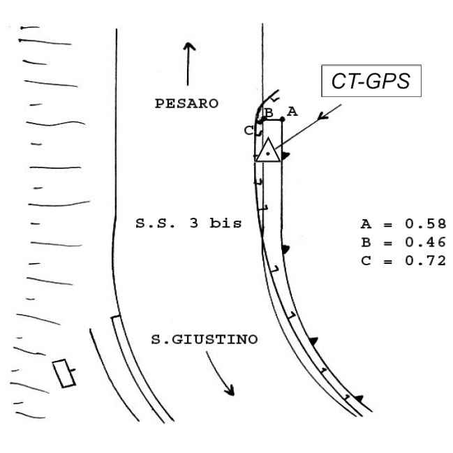 | Materializzazione | Centrino metallico infisso sulla sommità, lato nord, del muro di sostegno in calcestruzzo a valle della S.S. 3 bis di Bocca Trabaria, al Km 20+350, dopo aver oltrepassato il valico, nel comune di Borgo Pace. |