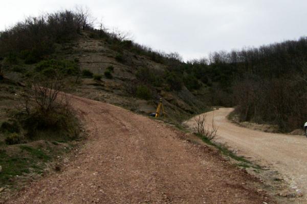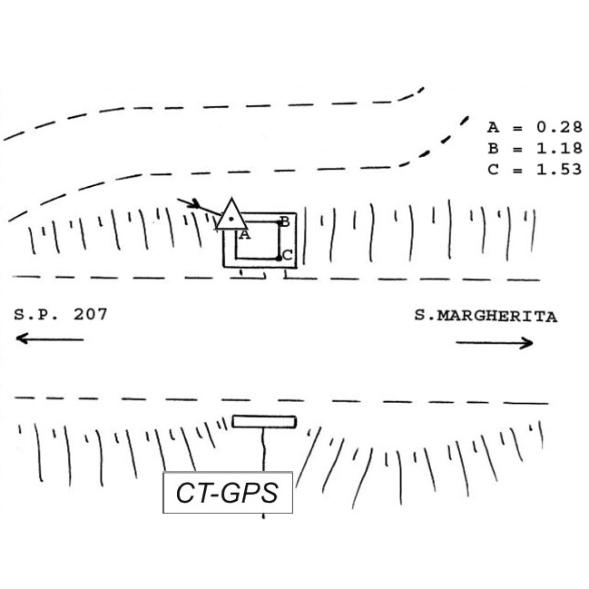 Centrino metallico infisso sullo spigolo nord-ovest del tombino in calcestruzzo della strada non asfaltata che conduce a Santa Margherita, nei pressi dell'incrocio con il km 7 + 400 della S.P. 207 di Caicambiucci.
