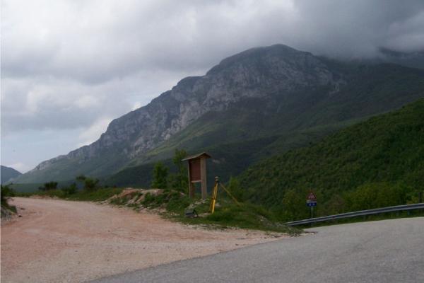 | Materializzazione | Centrino metallico infisso su pilastrino in calcestruzzo posto all'incrocio della S.P. 226 di Isola Fossara con la strada non asfaltata che conduce a Monte della Strega. |
