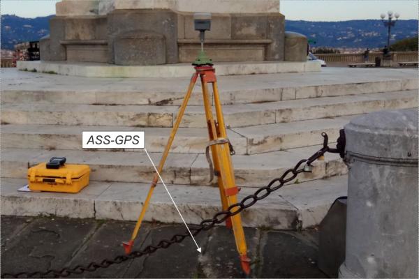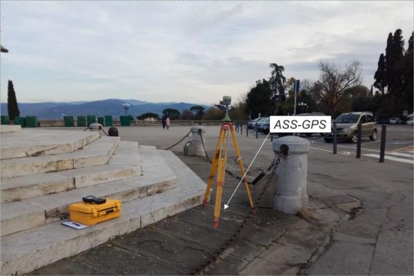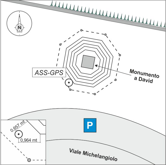 Centrino in acciaio inox del tipo "GPS D" infisso nella pavimentazione lato sud-ovest del monumento al David.