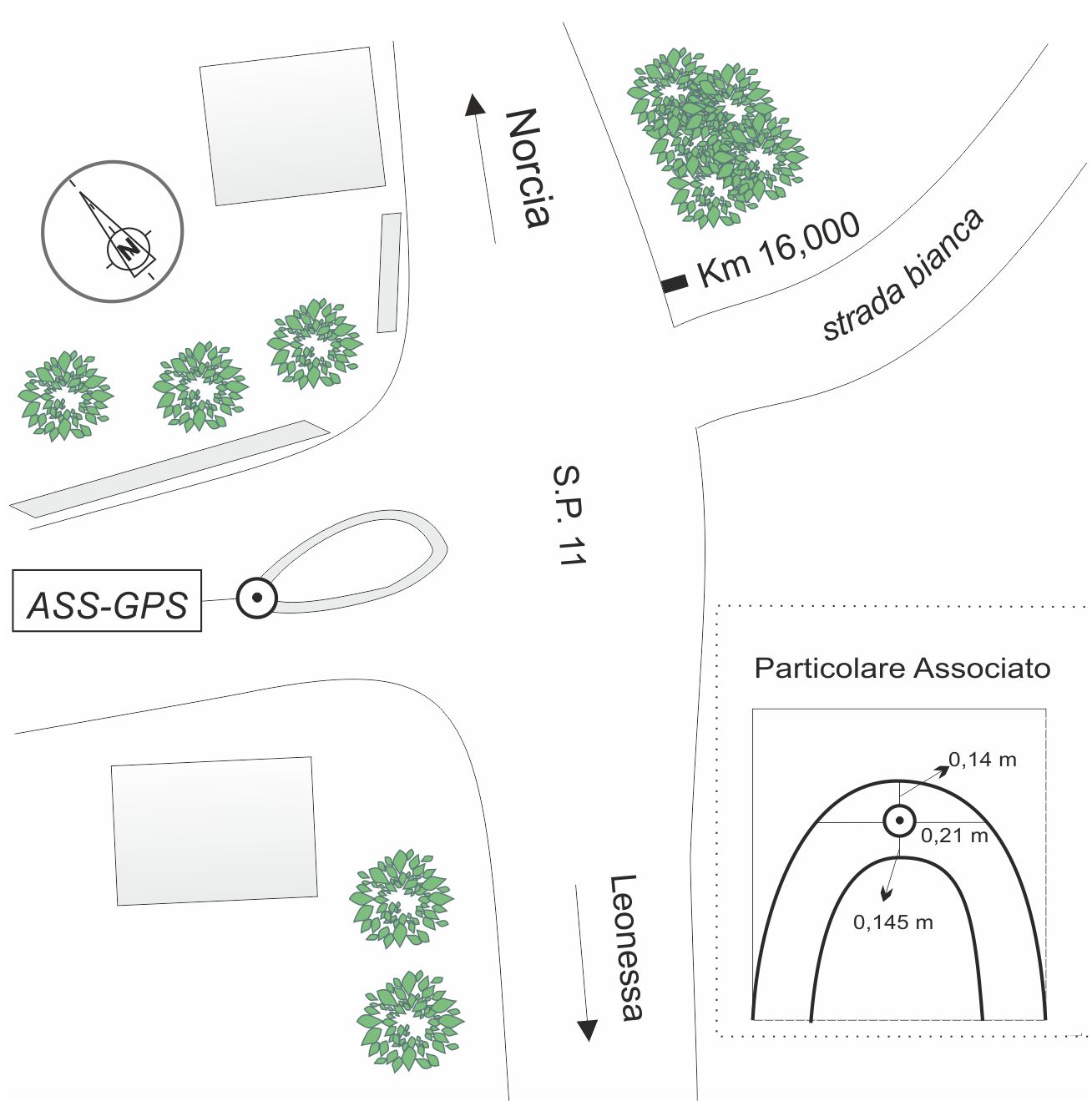 | materializzazione | Centrino in acciao inox del tipo GPS D, infisso nel cordolo dello spartitraffico stradale che porta al centro del paese di Trimezzo. |