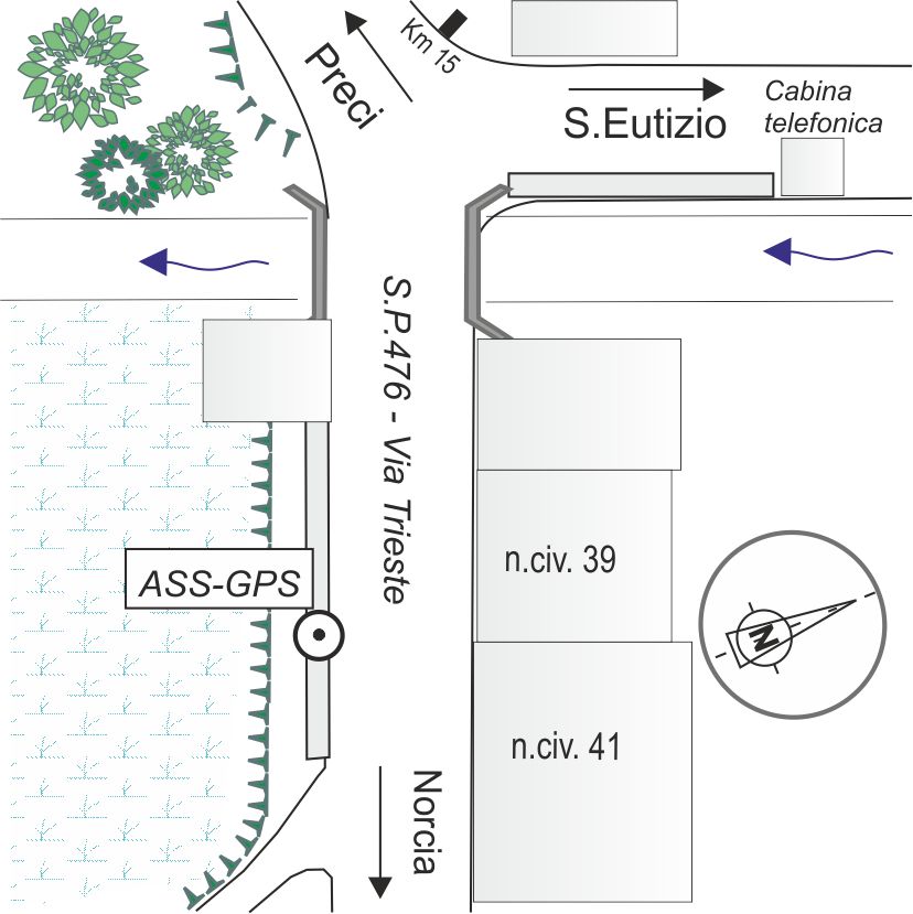 | materializzazione | Centrino in acciaio inox del tipo "GPS D", infisso sulla sommità del muro della balaustra della S.P.476 che attraversa la frazione di Piedivalle, a destra in direzione Norcia e dopo circa 130 mt dal bivio per S.Eutizio. |