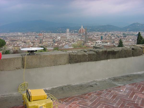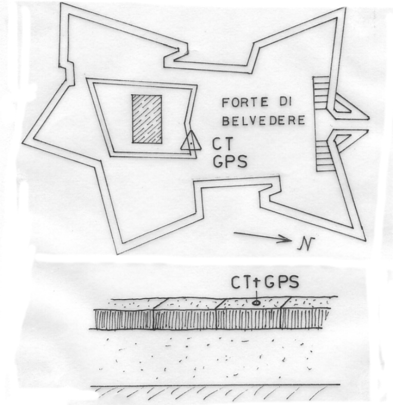 Centrino in acciaio inox del poligono di taratura strumentale dell'IGM infisso sulla testa del parapetto del muro in pietra delimitante la terrazza dell'edificio centrale del Forte di Belvedere .