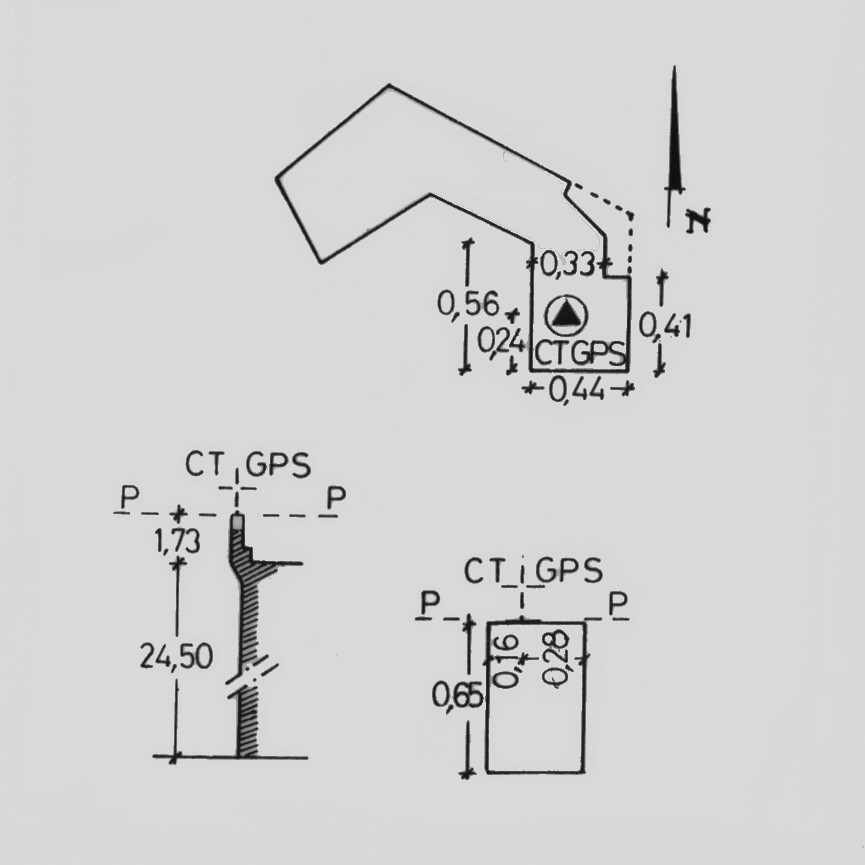 | materializzazione | Vite (passo tipo Wild T2) punzonata al centro, sporgente da una piastra, in acciaio cementata alla sommità del merlo d'angolo nord della torre più alta del castello, (torre ovest), ubicato in prossimità del municipio e dell'ospedale. |