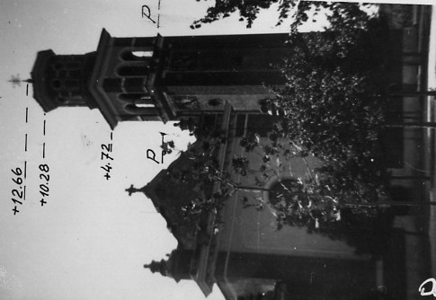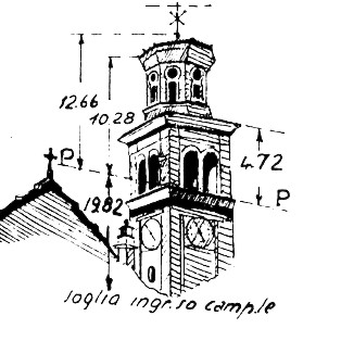 | Materializzazione | Campanile della chiesa parrocchiale. Asse geometrico del campanile materializzato dalla croce alla sommità. |