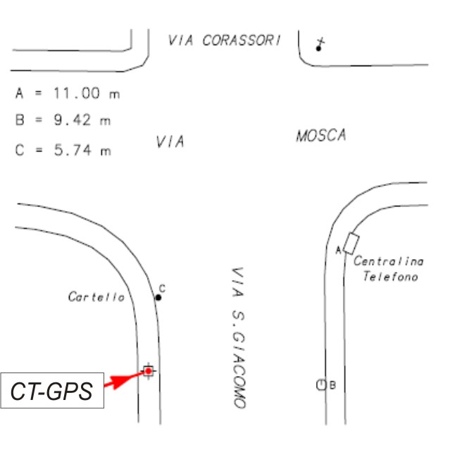 | materializzazione | Centrino metallico infisso sul muro in cemento posto all'incrocio tra Via Mosca e Via San Giacomo. |