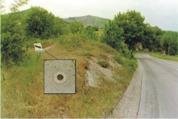 | materializzazione | Centrino metallico infisso su piccola montagnola, parzialmente in roccia. |