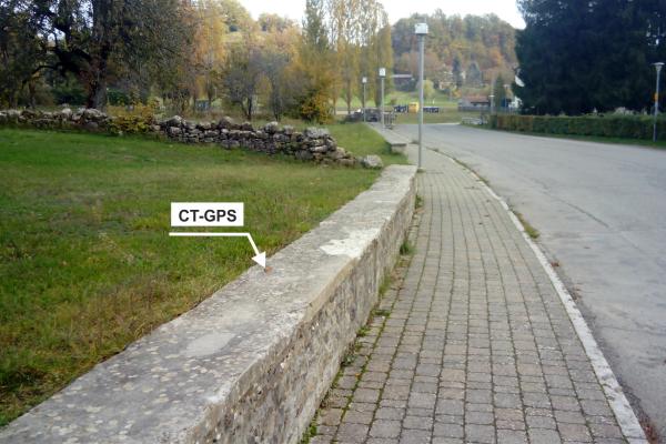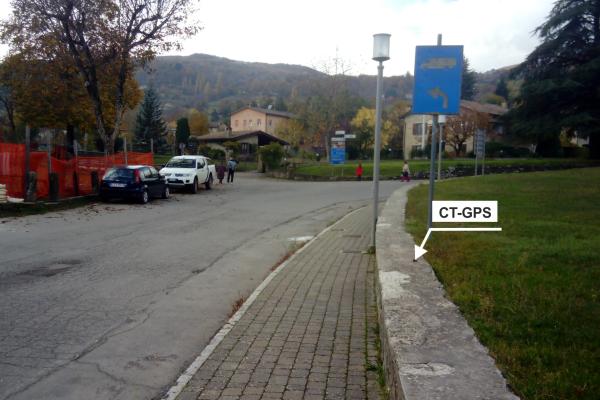 Centrino metallico infisso sul muro a lato della strada davanti alla chiesa di Frazione Mercato. (A=1,985; B=0,37).