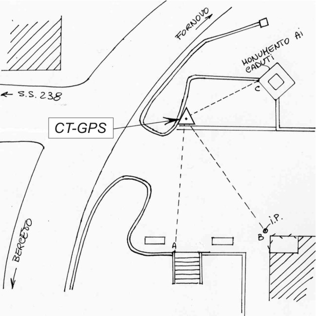 | Materializzazione | Centrino metallico infisso sul pavimento in pietra della piazzetta con Monumento ai Caduti in Località Cassio di Parma, di fronte al bivio con la strada che porta alla S.S. 238. A=10,91; B=12,60; C=10,82 |