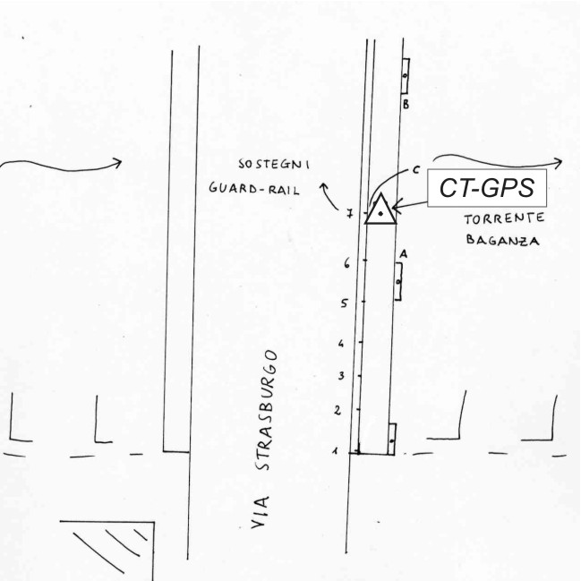 | materializzazione | Centrino metallico infisso sul marciapiede del ponte sul torrente Baganza in località Calestano lato valle sponda destra, tra il secondo ed il terzo sostegno in cemento armato del parapetto. (a=7,60; B=7,65,C=0,77). |