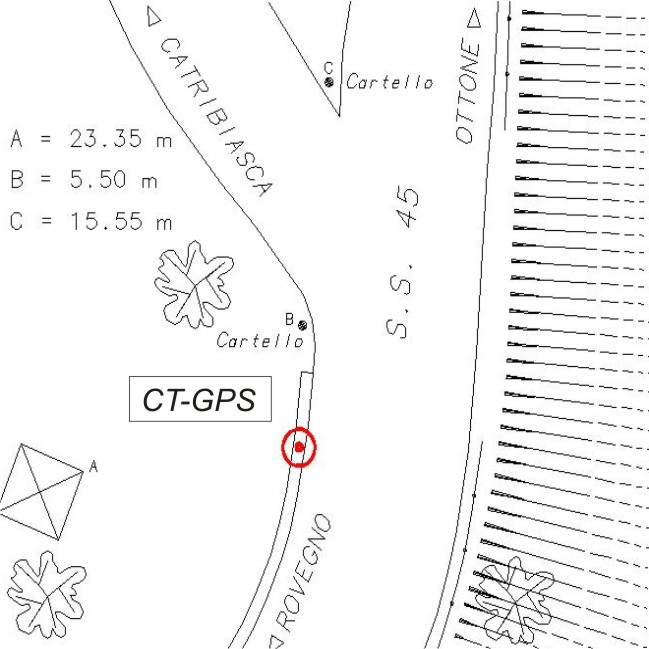 | materializzazione | Centrino metallico infisso sul grosso cordolo in cemento sul bordo ovest della S.S. 45, 6 metri circa oltre il bivio per Ctatrebbiasca, salendo da Ottone. |