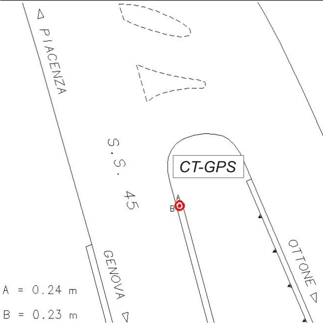 | materializzazione | Centrino metallico infisso presso lo spigolo nord del trave del viadotto, lato est della S.S. 45, prossimo allo svincolo per il centro di Ottone. |