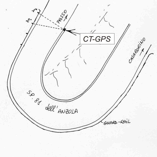| materializzazione | Centrino metallico infisso sul cordolo in cemento armato della scolina stradale che si trova sul tornante posto 400 metri dopo il bivio per Volpara, salendo verso il fosso. 1=paletto guard rail 9,26; 2=paletto guard rail 8,75. |