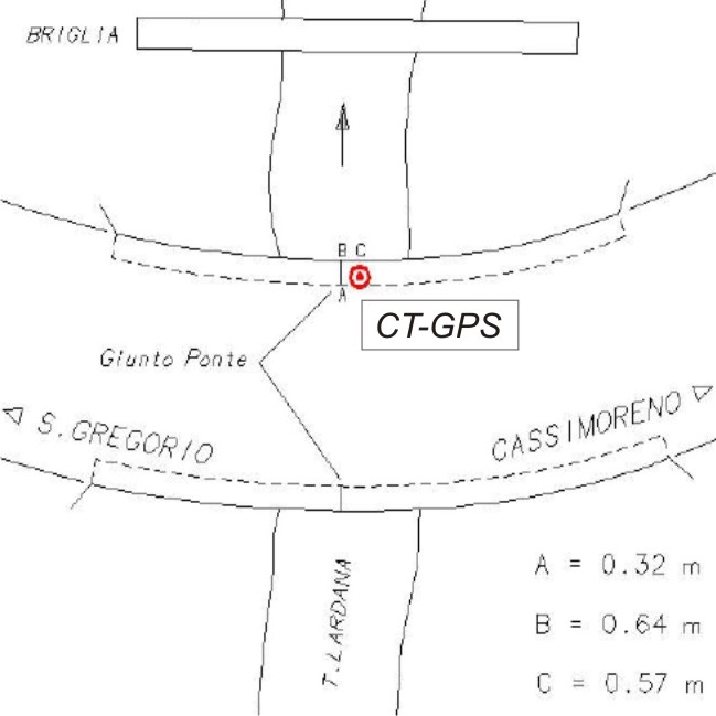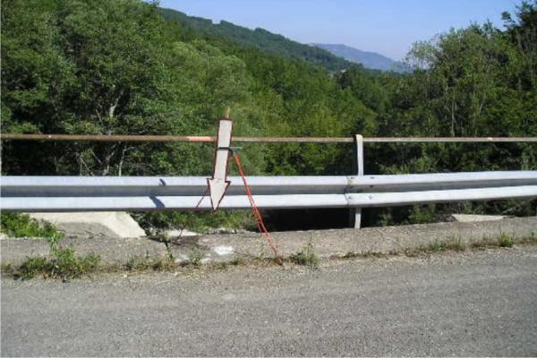 Centrino metallico infisso su marciapiede in cemento al centro del ponte sul Torrente Lardana, lato valle.