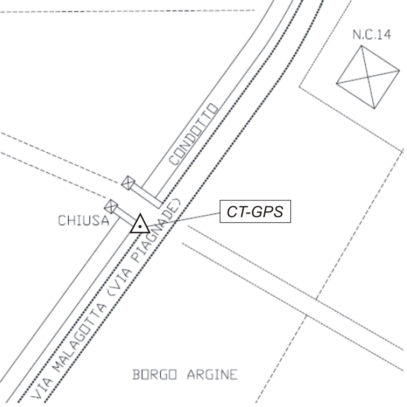 Centrino metallico infisso sulla spalla in mattoni con cordolo in cemento della chiusa in Via Pignare.