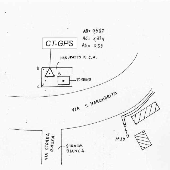 | materializzazione | Centrino metallico infisso su manufatto in cemento armato del tombino del gas sito in Via Santa Margherita di fronte all'incrocio con la strada bassa. |